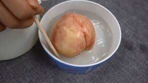 1. 將水蜜桃放入熱水內浸約20秒,可用筷子攪動水蜜桃讓它均勻地浸到熱水。