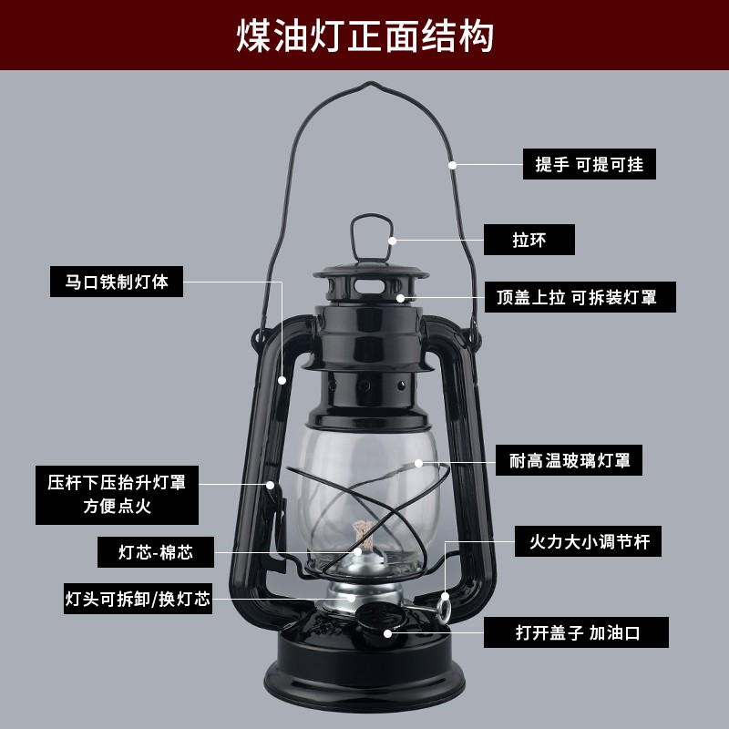煤油燈有唔同設計,座檯型和手提外帶型也有。發光部扁芯、管芯、燈紗三種。